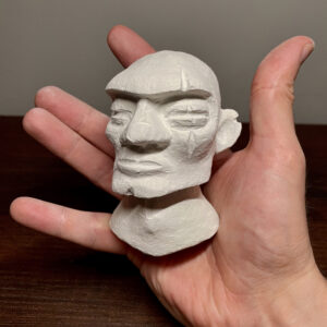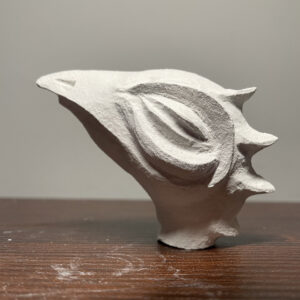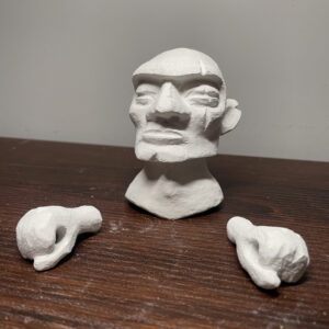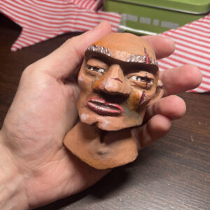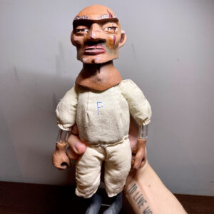Mixed media sculpture (clay, wire armature, fabric, acrylic, feather hair)